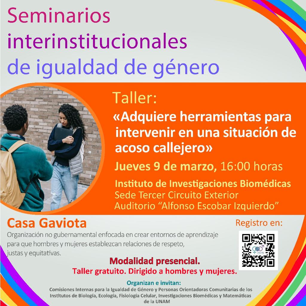 Seminarios interinstitucionales de igualdad de género les invitan, este jueves 9 de marzo a las 16:00 hrs, al taller presencial "Adquiere herramientas para intervenir en una situación de acoso callejero"