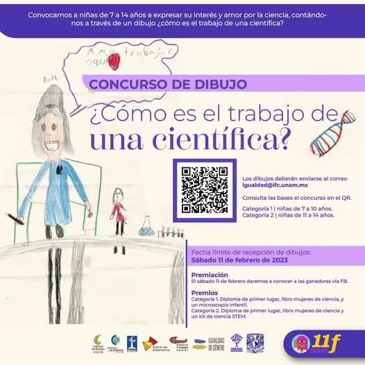 ¿Cómo es el trabajo de una científica? esta convocatoria es para que niñas de 7 a 14 años nos compartan su amor e interés por la ciencia a través de un dibujo. Más informes en el cartel y en el QR. La fecha límite de recepción de dibujos es el 11 de febrero