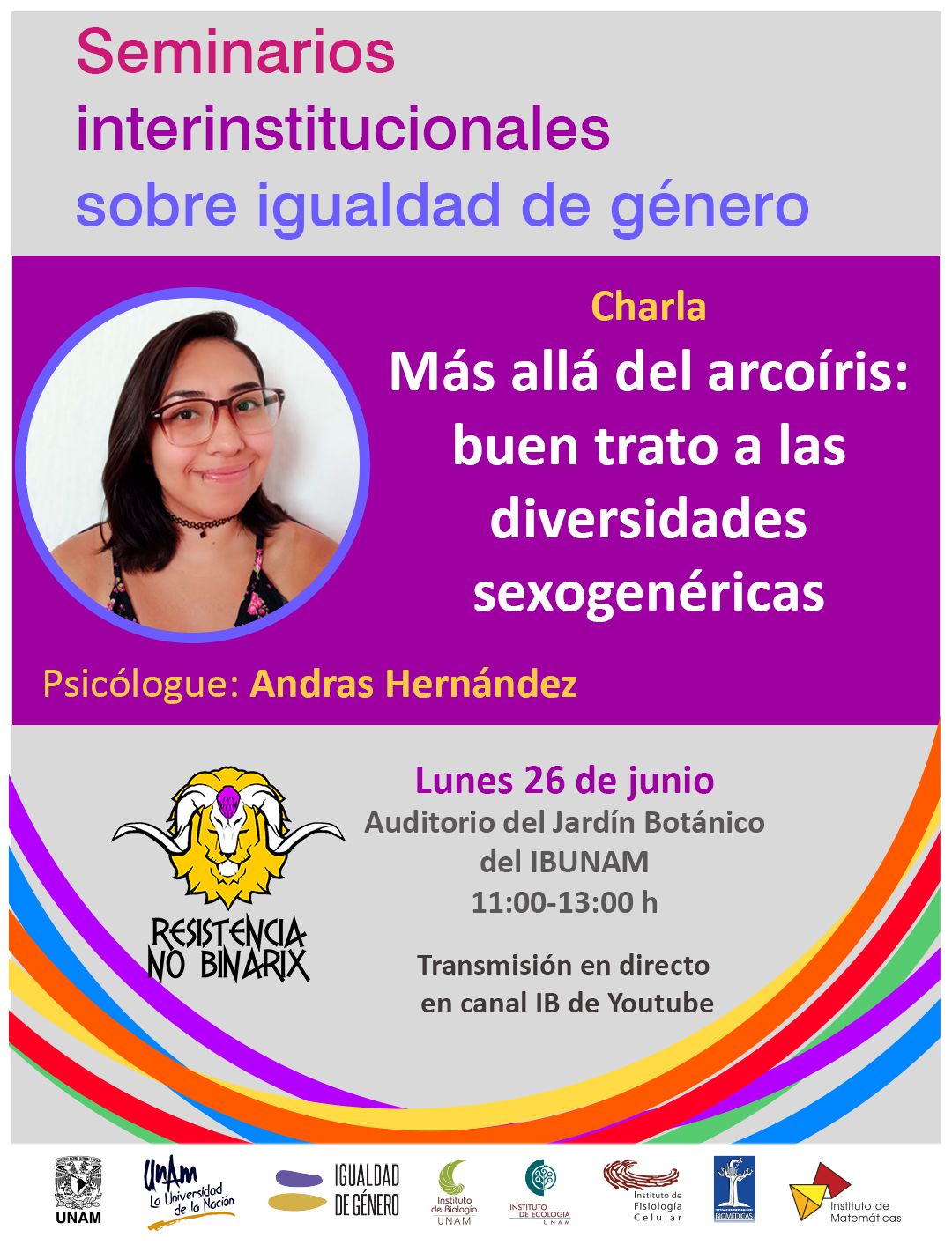 Les invitamos a la charla "Más allá del arcoíris: buen trato a las diversidades sexogenéricas", que impartirá le psicólogue Andras Hernández el próximo lunes 26 de junio de 11 a 13 hrs. En esta charla, para comprender a qué nos referimos al utilizar el término "diversidades sexogenéricas", ahondaremos en las diferencias entre sexo, género, orientación sexoafectiva, identidad de género y expresión de género, explorando también técnicas que nos permiten brindar un buen trato a dichas diversidades. ¡Les esperamos en el Auditorio del Jardín Botánico de 11 a 13 hrs., o conéctate a youtube aquí https://www.youtube.com/@canalib6347 !