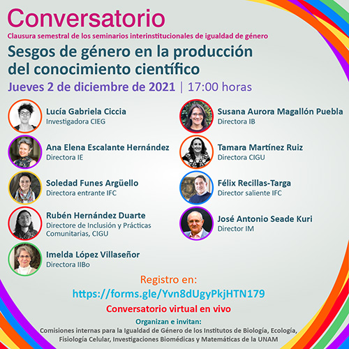Como parte de las actividades del #25N, este jueves 2 de diciembre a las 17 hrs les invitamos a la clausura semestral de los seminarios interinstitucionales de igualdad de género, que llevaremos a cabo con el conversatorio virtual en vivo titulado Sesgos de género en la producción del conocimiento científico.